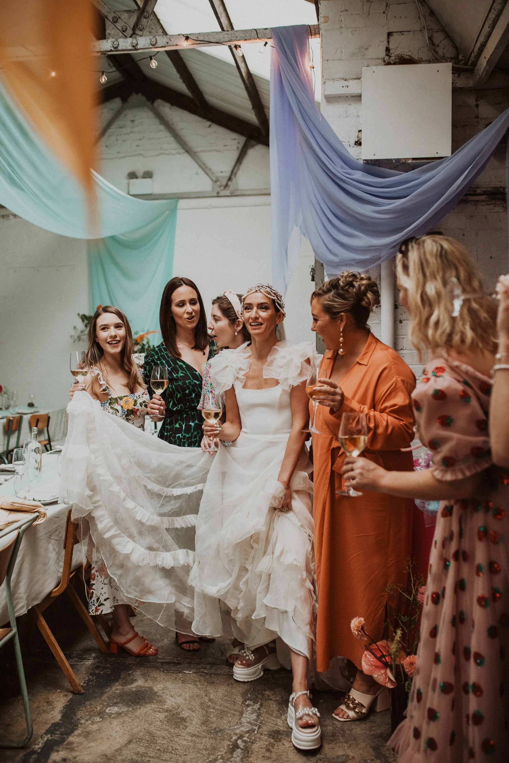 Laura and Andy attended the Feb 2020 show and of course the rest is history but those connections and inspirations made endured and were victorious at their glorious Hackney shindig. An almagamation of all those trends we forecast with the 2020 campaign, romantic bows and pearls, but evolved with that 2021 twist of colour pops and Dad-trainer inspired bridal footwear, and of course Andy and Laura’s own style.